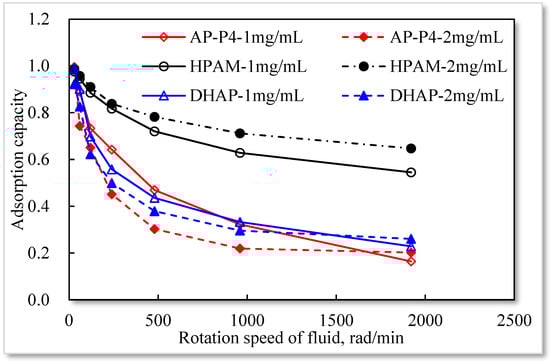 By comparing the ratio of dynamic and static adsorption capacity under different stirring rates (see Figure 14), the following were determined: There is no association between HPAM and concentrations of 1 and 2 mg/mL. The increase in solution concentration raises the intermolecular interaction force, enhances the adsorption force on the surface of the medium, and decreases under the influence of external force. Under the influence of hydrophobic association, the entanglement force between AP-P4 and DHAP molecules increases considerably, which is affected by the external force. With an increasing stirring rate, the entanglement force rapidly drops and tends to stabilize, indicating that the physical adsorption of the multimolecular layer formed by association is a reversible process. Before the critical association concentration, the hydrophobic group of the molecular chain produces part of the intramolecular association, which increases the intramolecular force to a certain extent and is more affected by the external force. After the critical association concentration, the intermolecular association dramatically increases the interaction between free and adsorbed molecules, so the external force has a more prominent effect. Compared with the concentration of 1 mg/mL, the adsorption capacity of 2 mg/mL solution decreases with an increased stirring rate. The branching structure of the polymer solution cannot change its adsorption force on the surface of the medium, it can only increase the thickness of the adsorption layer through its stretching spatial structure. The key to the balance between adsorption and external force is the main factor affecting the dynamic adsorption capacity. Changing the flow state of the polymer fluid in porous media can improve its adsorption capacity, laying the foundation for the technical guidance of changing mobility control through technological means.