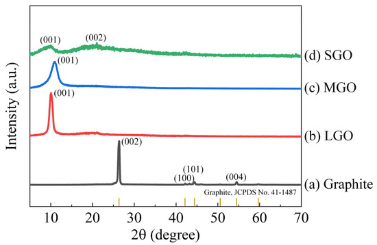 X-ray diffraction (XRD) patterns of (a) graphite, (b) LGO, (c) MGO, and (d) SGO.