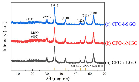 After magnetostrictive CFO intercalation into the interlayer of the GO sheets, XRD patterns were investigated to confirm the spinel crystal structure (AB2O4) and magnetostrictive material intercalation, as shown in Figure 4. The magnetostrictive fillers of CFO-i-LGO, CFO-i-MGO, and CFO-i-SGO exhibited clear peaks of (111), (220), (311), (440), (422), (511), and (440), which represent the cubic spinel structure of CoFe2O4 (JCPDS, No. 22-1086). The XRD patterns of the CFO-i-LGO and CFO-i-MGO fillers revealed that the main peak of (001) in the LGO and MGO sheets disappeared, which was due to the successful CFO intercalation into the interlayer of the LGO and MGO sheets [27]. This suggests that Co2+ and Fe3+ ions were intercalated into the interlayer of the GO sheets owing to electrostatic interaction between the negatively charged GO and positively charged metal ions, resulting in the crystal growth of CFO particles into the interlayer of the GO sheets [28,29]. However, in the CFO-i-SGO fillers, there might be few CFO intercalations into the interlayer of the SGO sheets, which was attributed to the destructive interlayers (Figure 2d) due to excessive sonication.
