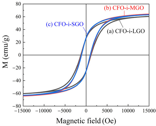 The M-H loops of CFO-i-LGO, CFO-i-MGO, and CFO-i-SGO fillers were investigated with saturation magnetization (Ms), remnant magnetization (Mr), and coercive field (Hc), as shown in Figure 6. Table 2 shows slight differences of ∆Ms = 5.7% and ∆Mr = 3.1% from the three types of fillers because there might be independent CFO particles, except for the CFO in the GO interlayer and the CFO on the GO sheet surface. Conversely, with a decrease in the lateral size of the fillers, Hc continuously decreased with ∆Hc = 12.85%, from 1256.81 Oe (CFO-i-LGO) to 1095.28 Oe (CFO-i-SGO), which might be caused by the free spin movement from the independent CFO particles compared to the intercalated CFO in the GO sheets [31].