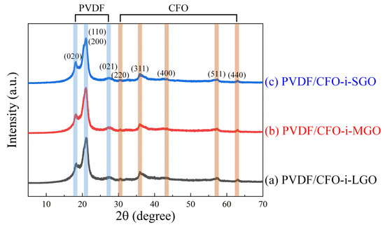 XRD patterns of the 3-2 type ME films of (a) PVDF/CFO-i-LGO, (b) PVDF/CFO-i-MGO, and (c) PVDF/CFO-i-SGO.