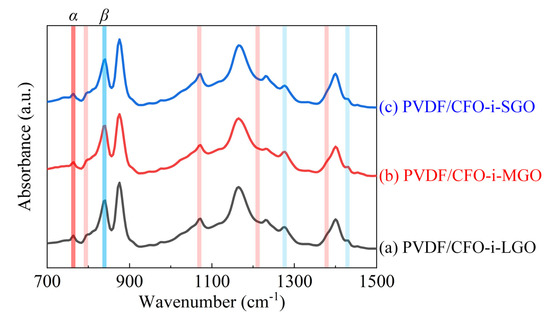 Fourier-transform infrared (FT-IR) spectra of the 3-2 type ME films of (a) PVDF/CFO-i-LGO, (b) PVDF/CFO-i-MGO, and (c) PVDF/CFO-i-SGO.