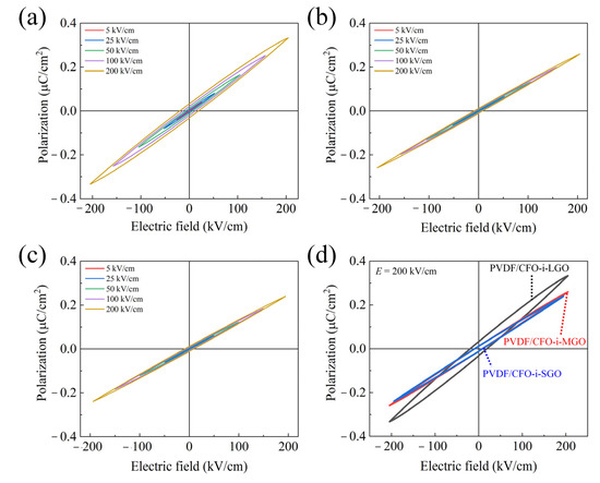 P-E hysteretic curves of the 3-2 type ME films of (a) PVDF/CFO-i-LGO, (b) PVDF/CFO-i-MGO, and (c) PVDF/CFO-i-SGO, and (d) P-E comparison under an applied electric field of 200 kV/cm.
