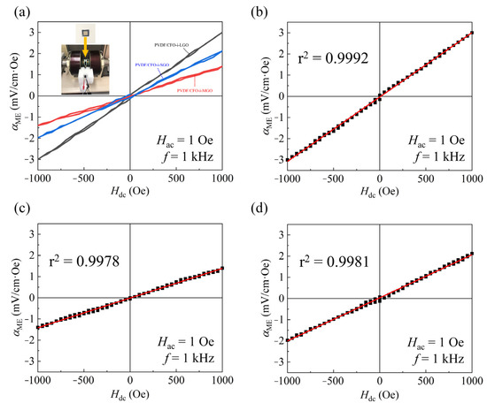 To investigate the ME responses of the films, the αME was measured by applying an alternating current (ac) magnetic field (Hac) of 1 Oe at an off-resonance frequency (f) of 1 kHz under a dc magnetic field (Hdc) of ± 1000 Oe, as shown in the inset of Figure 10a. As shown in Table 5, the ME values of αME are 3.0 mV/cm∙Oe (PVDF/CFO-i-LGO), 1.4 mV/cm∙Oe (PVDF/CFO-i-MGO), and 2.13 mV/cm∙Oe (PVDF/CFO-i-SGO). The results illustrate that a maximum αME of 3.0 mV/cm∙Oe was achieved from the PVDF/CFO-i-LGO films with effective strain transfer and high piezoelectric properties. The αME value of 2.14 mV/cm∙Oe for the PVDF/CFO-i-SGO films shows that the considerable dispersion of the magnetostrictive fillers in the piezoelectric matrix is important for high ME responses in the particulate ME films. Even though the PVDF/CFO-i-SGO films were found to exhibit relatively low values of β-phase, Ps, electric strength, and d33 compared to those in the PVDF/CFO-i-MGO films, relatively high αME values were obtained owing to the enlarged active area (Figure 1i) in the PVDF/CFO-i-SGO films. In particular, the 3-2 type polymer-based ME films exhibited proportional ME responses with a linear behavior under an applied Hdc of ± 1000 Oe. To determine the sensing capability, the linearity of the ME films was calculated, and the r2 values were 0.9992 (PVDF/CFO-i-LGO), 0.9978 (PVDF/CFO-i-MGO), and 0.9981 (PVDF/CFO-i-SGO), greater than those reported in the literature [43]. Therefore, the 3-2 type polymer-based ME films with reliable ME responses have a high feasibility and can be used in ME devices for biomedical-sensing applications.