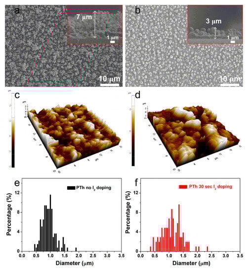 Figure 1a shows the planar and cross-sectional SEM images of the PTh films deposited at RT for 60 s through novel APPJs polymerization technique. The pure (undoped) PTh films consisted of dense nanoparticles with porous networks and showed very fast deposition rates of about 7 μm·min−1 (inset of Figure 1a). Most of nanoparticles vanished after I2 doping for 30 sec as shown in Figure 1b and the thickness of the PTh films decreased to 3 μm (inset of Figure 1b). To further investigate the characteristics of the PTh films, roughness (Rrms) and grain diameter of PTh films were studied by the AFM measurement as can be seen in Figure 1c–f. The pure PTh surface showed relatively small-size protrusions and the surface Rrms was 370 nm. On the other hand, after I2 doping for 30 sec, lots of large protrusions appeared on the PTh surface and the Rrms increased to 890 nm. In addition, as shown in the granularity cumulation distribution charts in Figure 1e,f, the diameter range for the pure PTh sample was between 0.4 and 1.8 μm. After I2 doping, however, the diameter range became wider, between 0.3 and 2.3 μm due to particle aggregation, thereby increasing the grain size. The increase in the average grain diameter from 0.8 to 1.1 μm after I2 doping means that I2 doping decreases the number of grain boundaries. This decreased number of grain boundaries was mainly due to particle aggregation and disconnected networks between adjacent nanofibers from higher porosity. For this iodine doping process, the particles were aggregated due to the hydration and I2 particles. The surface morphology of the doped PTh film was changed a more globular particle and rougher surface by an incorporation of iodine. The surface of the doped PTh film presents large grains separated by smooth areas. This type of topography can be attributed to the branched molecular geometry of the doped PTh film, which would facilitate the formation of granular agglomerates. These results are similar to the tendency of the APP polymerized polyaniline nanoparticles vanished and aggregated after I2 doping [10]. Thereby, the surface morphology of the doped PTh film was changed into a more globular particle owing to the aggregated particles by an incorporation of iodine [10,17,18].