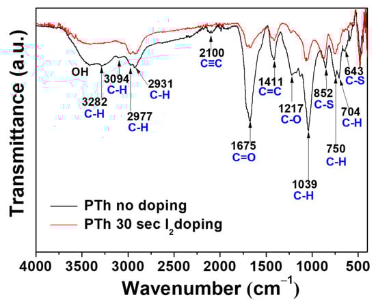 In order to identify chemical composition of PTh films, we analyzed the films by using FT-IR and XPS techniques. Figure 2 shows the obtained FT-IR spectra of the PTh films synthesized by the novel APPJs polymerization technique. The small peak of the C–H stretching vibration of the alkyne bond was observed in the peak at 3282 cm−1. Furthermore, the peak at about 2100 cm−1, which in that case could be attributed to triple bond C≡C stretching of alkyne functions, seems to be present in pure PTh film [18,19,20]. The spectrum of polymer contains the peak at 3094 cm−1 that can be assigned to the C–H stretching of the aromatic proton bands within the thiophene ring. The two small peaks at 2977 and 2931 cm−1 can be also assigned to the C–H stretching vibration. A peak belonging to the C=O symmetric stretching vibration modes of thiophene ring was located at 1675 cm−1 [19]. This carbonyl group is formed due to the reaction of thiophene and oxygen in ambient air. This functional group provides the hydrophilic into the film. Therefore, water from the ambient air is absorbed, thus resulting in forming the O–H stretching bond at around 3500 cm−1 in the PTh film [19,20]. The peak at 1411 cm−1 is a characteristic of the aromatic C=C stretching vibration. A peak belonging to the C–O stretching bond was located at 1217 cm−1. The peaks at 1039, 750, and 704 cm−1 are related to in-plane and out-of-plane C–H deformation vibration in the thiophene ring. The two peaks at 852 and 643 cm−1 can be assigned to the C–S bending [21,22,23,24,25]. Those results confirm the presence of thiophene ring in the PTh film structure. The absorption peaks at 1675 and 1217 cm−1 confirm the inclusion of small amounts of oxygen in the films, incorporated during plasma deposition [25]. These small amounts of oxygen could have originated in the oxidation of the PTh from ambient air [19,20]. After I2 doping for 30 sec, most of the spectra peaks significantly diminished and became smooth, presumably due to the absorption of hydrogen in the PTh films via the I2 doping. Iodine probably reacted with residual radicals in the PTh films by the doping. Iodine radicals can also be formed by the hemolytic dissociation of iodine. As iodine radicals can extract hydrogen atoms from the PTh structure, this could change the bonding characteristics of plasma polymerized films [18,20,21,22,23,24,25,26,27]. In particular, hydrogen iodide formed by reaction of iodine radicals and hydrogen atom can react with C≡C bond, thus causing the disappearance of C≡C bond after I2 doping [20]. In addition, after I2 doping process, the decrease of spectra intensities is presumably due to the decrease in the relative amounts of surface reflection, which is originated by film properties, such as particle size and surface roughness of the film [28].