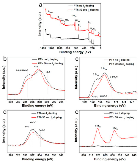 Chemical composition of the PTh films obtained by FT-IR spectra was analyzed by comparing the XPS results. In Table 1 and Figure 3a, the elemental concentration in atomic percentages and survey spectra identified from XPS are presented. The high-resolution C 1s, S 2p, O 1s, and I 3d peaks were analyzed in detail, as presented in Figure 3b–e and Figure S2 in the Supplementary Material. The peak assignments and envelope compositions of various C 1s, S 2p, and O 1s were summarized in Table 2, Table 3 and Table 4, respectively. The XPS survey spectra in Figure 3a show signals corresponding to C 1s (285.5 eV), S 2s (228.0 eV), S 2p (164.0 eV and 168.5 eV), O 1s (532.1 eV), I 3d3/2 (620.6 eV), I 3d5/2 (631.0 eV), and I 4d (53.0 eV) electronic orbitals. The presence of O atoms in the PTh plasma polymerized films is expected because we synthesized the PTh films under ambient air and the films obtained through APPJs polymerization technique are an oxidized state of polymer, which are in agreement with the FT-IR data. The C 1s peak could be divided into three distinctive component peaks (Figure 3b and Figure S2 in the Supplementary Material, and Table 2) attributed to C–C, C=C, C–H bonds (284.7 eV), C–S bond (287.5 eV), and C–O bond (290 eV) [25]. The S 2p peak could be split into three component peaks (Figure 3c and Figure S2 in the Supplementary Material, and Table 3) mainly contributed by aromatic sulfide (C–S–C, 163.6 eV), sulfoxide (C–SO–C, 166.38 eV), and sulfone (C–SO2–C, 168.9 eV) [29]. The O 1s peak was decomposed in three peaks (Figure 3e and Figure S2 in the Supplementary Material, and Table 4). From the spectra of O 1s, it could be seen that S-doped carbon displays the same oxygen species of O–C–O (532.3 eV) and O=C–O (534.7 eV). In addition, it also had a characteristic peak at 531.1 eV, which was attributed to the S-containing group S=O [29,30]. The XPS spectra exhibited by I 3d core of the I2-doped PTh are shown in Figure 3e, which shows the location of I 3d5/2 and I 3d3/2 peaks at the binding energy of 620.6 and 631.0 eV, respectively. The location of these peaks and the peak separation of 10.4 eV strongly suggest the I2-doped polymer characteristics [30,31]. After I2 doping for 30 sec, the carbons with oxidation, such as C–O and O–C–O, were remarkably decreased, which showed more hydrophobic characteristics [10,15]. The atomic percentage of C–C, C–H, and C=C bonds decreased from 39.9 to 31.7%, indicating some disruption to the conjugated framework of the films [31]. Whereas, S-containing groups with carbon and oxygen, such as C–S, C–SO–C, C–SO2–C, and S=O except for C–S–C, increased when adopting the I2 doping. Therefore, total amounts of oxygen decrease only slightly. In addition, since iodine could easily absorb hydrogen from materials, this reduced the C–H bond.