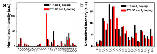 Normalized intensities of (a) negative-ion spectra and (b) positive-ion spectra of ToF-SIMS on surface of the plasma polymerized thiophene films without and with I2 doping.