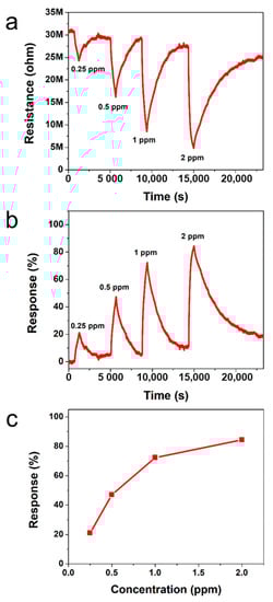 Figure 5a,b show the dynamic resistance and response of the gas sensors to various NO2 concentrations ranging from 0.25 to 2 ppm, respectively. It is observed that the exposure of PTh films to NO2 results in a decrease in value of resistance and the resistance of the PTh films gradually recover to its initial value when NO2 gas is turned off. It is known that PTh is a p-type material and NO2 is an oxidizing gas (electron acceptor). When PTh interacts with NO2, the concentration of majority charge carriers (holes) increases, which implies that the conductivity of p-type PTh increases. The initial base resistance (~31 MΩ) shifts toward lower resistance (~28 MΩ right before exposure to 2 ppm) with an increase in the NO2 concentration because the longer time is required for full recovery. Figure 5c shows the response of PTh films as a function of NO2 concentration. The gas response is increased with an increase in the NO2 concentration and the response of the PTh films was 21, 47, 72, and 84% for the NO2 concentration of 0.25, 0.5, 1, and 2 ppm, respectively. The gas sensors reported here exhibit highly sensitive behavior to NO2 compared to PTh based sensors reported previously, as shown in Table 5 [33,34,35]. To examine the repeatability of the sensor based on I2-doped PTh films, the NO2-sensing measurement was repeated, as shown in Figure S4 in the Supplementary Material. The difference in response between the first and second measurements at each concentration was within 5%, indicating good repeatability of the sensor based on I2-doped PTh films.