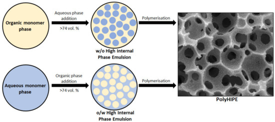 Porous polymers can be produced using several methods like direct templating, block copolymer self-assembly, direct synthesis, breath figures and high internal phase emulsion (HIPE) polymerisation, to name a few [10]. The main advantage of HIPE polymerisation is their ability to produce a highly porous and a three-dimensional highly interconnected scaffold, which facilitates cell ingrowth [11]. HIPEs are formed by mixing two immiscible liquids where one is usually the oil (organic) phase while the other is the water (aqueous) phase [12]. These phases can form a water-in-oil (w/o) or oil-in-water (o/w) emulsion. Essentially, one of the phases represents the internal (dispersed) phase, which has a volume fraction of at least 74.05% (maximum space that can be filled by uniformly sized spheres) or 64% (for random close packing), whereas the other represents the external (continuous phase) [13,14,15,16,17]. The formation of either a w/o or an o/w emulsion is dictated by the surfactant. If the surfactant is predominantly soluble in the oil phase a w/o emulsion is formed and if it is predominantly soluble in the water phase an o/w emulsion is formed [18]. After the formation of a stable HIPE, the continuous phase is polymerised and a polyHIPE is formed (Figure 1). PolyHIPEs have a hierarchically porous structure consisting of primary pores (cavities) and secondary, interconnecting pores (Figure 2). Both the chemical variety and the high porosity variety enable the formation of materials for specific applications, for instance, water clean-up [19], absorption and adsorption [20,21], separation processes [22,23], controlled release matrices [24] and tissue engineering [25]. Another aspect that makes polyHIPEs attractive is the available polymerisation techniques, such as atom transfer radical polymerisation (ATRP) [26], free-radical polymerisation (FRP) [27], reversible-addition-fragmentation chain-transfer (RAFT) [28], ring opening metathesis polymerisation (ROMP) [29] and click polymerisation [30], to name a few. In addition to building blocks, another property that can be freely controlled is the morphology of the prepared polyHIPEs. This can be done by increasing the internal phase volume, which increases the interconnectivity and the pore diameter [31]. The addition of different additives (solvents) also leads to an increase of both the cavity and interconnect diameters, due to the partial destabilisation of the emulsion [32]. Lastly, the pore size can also be adjusted through temperature control (increasing the temperature destabilises the emulsion and increases the cavity diameter) and stirring speed [33]. Besides the adjustability possible before the polymerisation, polyHIPEs can also be modified after the polymerisation, which is often necessary, as polyHIPEs tend to have a hydrophobic surface (prevents cell attachment). The surfaces can be made more hydrophilic by functionalising the surface with hydrophilic molecules or through plasma treatment [34,35,36].