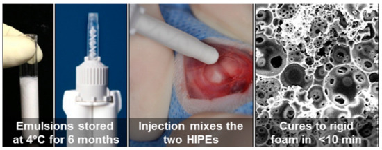 - Moglia, R.S.; Whitely, M.; Dhavalikar, P.; Robinson, J.; Pearce, H.; Brooks, M.; Stuebben, M.; Cordner, N.; Cosgriff-Hernandez, E. Injectable Polymerized High Internal Phase Emulsions with Rapid in Situ Curing. Biomacromolecules 2014, 15, 2870–2878. [Google Scholar] [CrossRef]