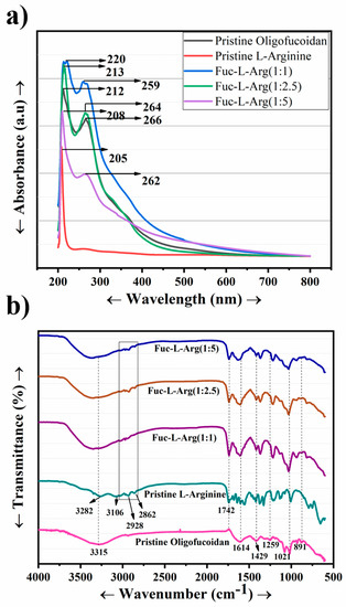 (a) UV absorbance of fucoidan, L-arginine, and their complexes; (b) FT-IR characterization of fucoidan, L-arginine, and their complexes.