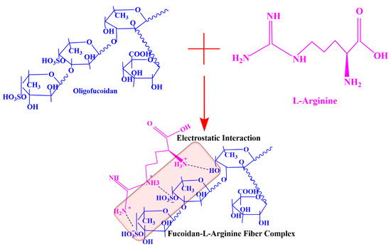 Schematic representation of the electrostatic interaction between fucoidan and L-arginine.