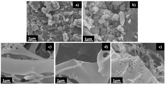 FE-SEM morphology: (a) pristine fucoidan, (b) pristine L-arginine, (c) Fuc-L-Arg (1:1) complex, (d) Fuc-L-Arg (1:2.5) complex, and (e) Fuc-L-Arg (1:5) complex.