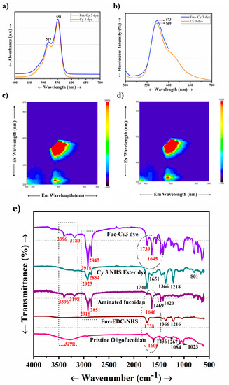(a) UV absorbances of the Cy3 NHS ester and Fuc-Cy3 dyes, (b) two-dimensional fluorescence intensities of the Cy3 NHS ester and Fuc-Cy3 dyes, (c) three-dimensional fluorescence intensity of the Cy3 NHS ester dye, (d) three-dimensional fluorescence intensity of the Fuc-Cy3 dye, (e) FT-IR studies of the Fuc-Cy3 fiber complex.
