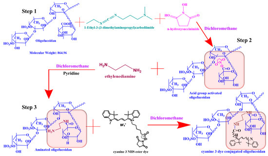 First, 1 mmol of the oligo-fucoidan acid group was activated using 3 mmol EDC and 4 mmol NHS in 10 mL DCM solvent, followed by stirring for 12 h. To the activated acid group, 8 mmol of EDA and 200 µL pyridine were added and stirred for 24 h to aminate the fucoidan. Later, the aminated fucoidan was purified using a 1000 MWCO dialysis bag in a DI water environment for two days and lyophilized. Then, to the 18 mmol of aminated fucoidan, 0.2 mmol Cys3 NHS ester dye in 10 mL DCM was added and stirred for 24 h. Furthermore, the Cy3 NHS ester dye-conjugated fucoidan was purified using a 1000 MWCO dialysis bag in a DI water environment for two days, lyophilized, and characterized.