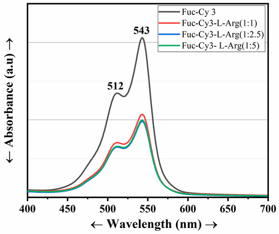 Prior to cellular internalization, the Fuc-Cy3-L-Arg fiber complex absorbances and intensities were observed using UV and photoluminescent spectroscopy, respectively. The Cy3 dye was then conjugated to fucoidan to assess cellular uptake. The UV absorbances of the Fuc-Cy3-L-Arg complexes (1:1, 1:2.5, and 1:5) were measured and determined to be similar to that of Fuc-Cy3 at 512 and 543 nm(Figure 6) [24,38]. The fluorescence intensities of the Fuc-Cy3-L-Arg complexes are shown in the supplementary data (S4). Thereafter, the confirmed Fuc-Cy3-L-arg complexes were used for further biocompatibility and cellular internalization studies.