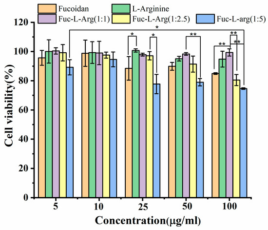 Cell viabilities of pristine fucoidan, pristine L-arginine, and the Fuc-L-Arg complexes (1:1, 1:2.5, and 1:5) in HeLa cells. Where * represents p < 0.05, ** p < 0.01.
