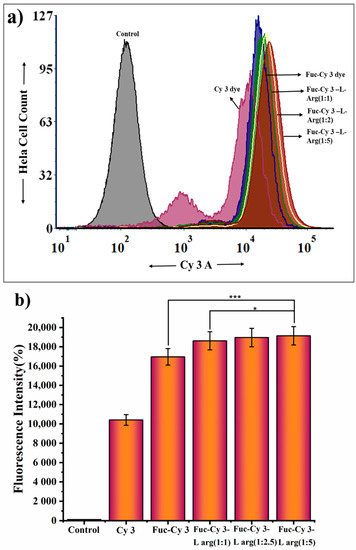 Quantitative flow cytometry analysis of (a,b) fluorescence intensity of control HeLa cells (without treatment), Cy3 dye-treated HeLa cells, Fuc-Cy3 dye-treated HeLa cells, Fuc-L-Arg (1:1)-treated HeLa cells, Fuc-L-Arg (1:2.5)-treated HeLa cells, and Fuc-L-Arg (1:5)-treated HeLa cells. Where * represents p < 0.05 and *** represents p < 0.001.