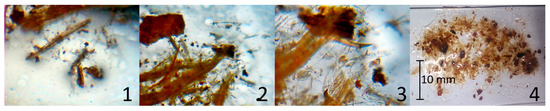 Bark fibres included in the length class 1.6 mm; magnification: 4×, 4×, 10×, reference picture; dependencies: 1 and 2 are details of 4; 3 is a detail of 2.