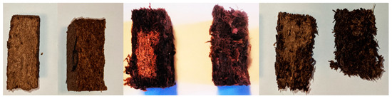 Water penetration over the cross section of the tested sample: fibre length 1.6 mm, wet and dry (left); fibre length 4 mm, wet and dry (middle); and fibre length 7 mm, wet and dry (right).