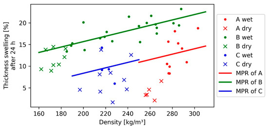 For TS and WA, after 24 h, a multiple polynomial regression (MPR) analysis was performed with the significant variables: intercept, density, fibre length, and fibre length squared. The regression of TS for the wet samples was highly significant and positively correlated, while R² showed a value of 0.61 (Figure 3). With a polynomial regression of the fibre length, it was possible to model the thickness swelling for all fibre bundle classes. A typical TS for wood-based panels shows a positive correlation with the fibre thickness [13]. Since with longer fibres an increased fibre thickness can be expected, when using the described defibration method, the 7 mm fibre bundle length (C) did not follow this prediction. Due to the reduced IB and density of this panel, combined with the low slenderness ratio, large holes and less felted regions can be expected, compared with 1.6 (A) and 4 mm (B) fibre lengths. This characteristic can affect the TS, since holes are a favourable field for the swelling fibres. For the dry samples, the regression was still significant; however, R2 was 0.47, most likely due to grouped density range of the dry samples. Additionally, the dry samples of fibre length 1.6 (A) and 4 mm (B) seem to have the lowest density of their classes. The difference in TS between wet and dry samples was not as strong as in the WA. It is assumed that the core fibres soaked up just enough water to stay under the equivalent of the fibre saturation point in wood. The highest TS 24 h value of 23% could be found for 4 mm fibre length (B), whereas the lowest values with 3.3% and 1.6% could be found for 1.6 mm (A) and 7 mm (C) fibres. Medium-sized fibres seem to have a disadvantage in terms of TS. The smaller density variation for 1.6 mm (A) and 7 mm (C) fibre length makes it hard to predict whether the TS and WA trends foreseen by the model are stable at other density levels, too.