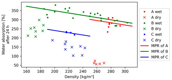 The water absorption (WA) after 24 h for the wet sample values varied from 217% to 380%, according to the production method and the absence of adhesive or hydrophobic additives. In contrast, in dry samples with 1.6 mm fibre length, values under 55% were achieved. Figure 4 shows relatively similar WA of wet samples of 1.6 mm (A) and 4 mm (B). As explained in previous subchapter TS, the WA of the C samples (7 mm) might be underestimated. If the WA of 7 mm fibre bundles is excepted from the measurement series, it could be stated that the fibre length seems to have little effect on the water absorption. Between the dry and wet samples of each fibre length, a sudden drop can be identified, which increases with decreased fibre length, indicating a polynomial corelation to the density, caused by the dry samples. In that case, it can be expected that with smaller fibre length and lower densities, the water absorption can be decreased, which in most cases is a favourable material property. The decreased water absorption of dry samples is considered to be caused by the increased pore size of lower density samples, which come along with a reduced capillary force, so the water could not be soaked into the sample. Assuming that, compared to wood, bark contains more hydrophobic substances, such as suberin [14], an improvement of water repellence can be observed in such composites. The regression of the WA shows a negative correlation with the density, which is also more significant and shows less prediction error due to an R2 of 0.73. Since similar studies [25] also show a negative correlation, the measured data correspond to the expectations. For the dry samples, a highly significant model with an R2 of 0.88 was obtained. As Figure 4 depicts, the dry samples appear grouped and do not show overlapping density areas like the wet samples. The accuracy of the model regarding the negative correlation of the dry samples model needs to be questioned. On the one hand, fibre bundles of 7 mm (C) and (A) indicate the negative correlation. On the other hand, the fibre bundles of 4 mm (B) seemed to follow more of a polynomial behaviour towards the density and therefore a positive correlation with the density in the corresponding interval.