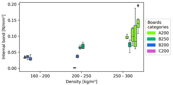 As depicted in Figure 3, the internal bond of C200 boards (7 mm fibre bundle length) shown in comparison to the other boards’ values close to 0.0 N/mm2. This behaviour can be explained due to thicker fibres that decreased the homogeneity and, as a consequence, the self-bonding capacity [13]. Within the other board categories (B200, B250, and A200), the IB showed almost no correlation with the density. Because such a correlation is typically for wood-based panels [13], this indicates together with the asymmetry of some boxplots (due to the scattering of internal bond, especially for the fibre length 1.6 mm (A)), that this effect is caused by variation within the panels. Because this variation increases with the density, heteroscedastic effects were detected by the “White-test” for heteroscedasticity within the regression model. Because a constant amount of process water was used during the panel manufacturing, the solid content of the fibre-water suspension of boards with higher density was subsequently higher than those of panels with lower density, therefore inducing more variation to the higher density boards. Simple linear regressions (SLR) involving only one fibre class do not show heteroscedasticity, and it is therefore a result of the larger dataset of the multiple linear regression (MLR). However, the variation of fibre length 1.6 mm seems to be higher than that of fibre length of 4 mm (Figure 6), slightly indicating that smaller fibres might be more prone to irregular fibre distribution during the forming process than longer fibres at the same density.