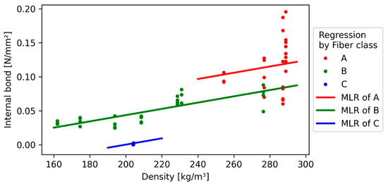The MLR shows an R2 of 0.7, while both variables (fibre length and density) are highly significant. Due to the uneven distribution of the samples of fibre length of 1.6 mm (A) and 7 mm (C), the results of the regression are only valid in areas, where data points are available. Additionally, its explanatory power is decreased by its heteroscedasticity. Irregular fibre distribution can lead to a decrease in the average performance of the board and an increased variation within the board [44]. Therefore, heteroskedasticity in the model indicates an underestimation of the slope of the model.