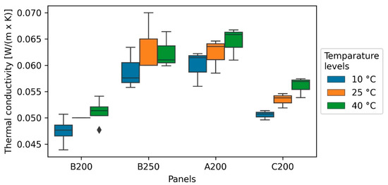 Thermal conductivity of bark fibreboards under different temperature levels (10, 25, and 40 °C).