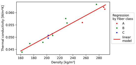 Similar to the IB, the TC also correlates highly significantly with the density, but in contrast to it, the fibre length was not significant, resulting in a simple linear model. However, some studies indicate a slight influence of the fibre length [45]. To exclude any influence of the fibre length, a larger data set is required. However, as Figure 8 presents, the regression model fits the data with R² of 0.94 in comparison to the other models quite well, most likely because density variation within the boards does not influence the outcome strongly. For the same reason, the model is not affected by heteroscedasticity like the IB model, even if it is possible for irregularities in the panel forming to also influence the TC to some extent.