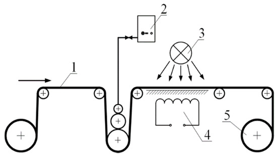 Schematics of tetrahydrofuran solution application, drying and storage in a roll. 1—film, 2—container with solution, 3—fan, 4—thermostat, 5—roll.