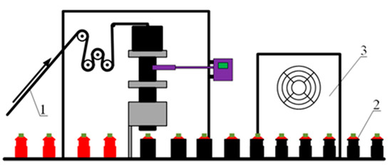 Schematics of heat shrinkage of films with hidden marking on containers using industrial equipment. 1—film with hidden marking, 2—container, 3—thermostat.