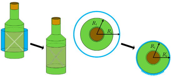 The manifestation of relief after heat shrinkage of a film with hidden markings on a cylindrical container. R1, R2, R2′ are dimensions of containers and shells on containers before and after heat shrinkage.