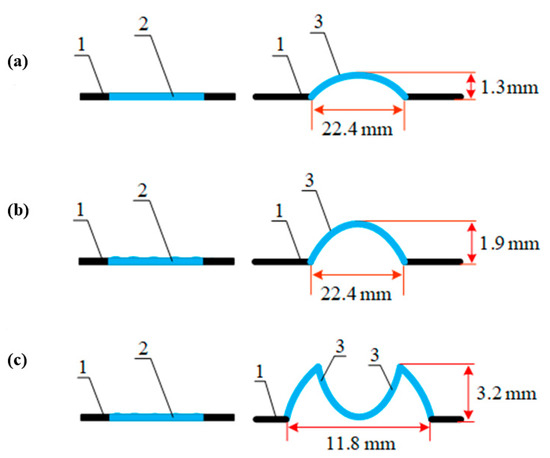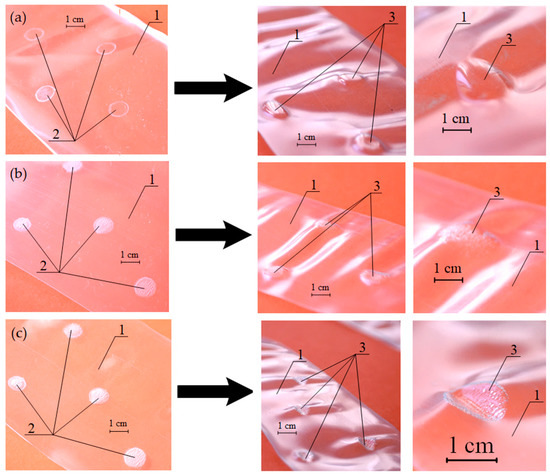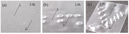 SMP PVC film after local heat treatment under isometric conditions (recording stage) and thermally stimulated free shrinkage (development stage). Tactile relief: (a) treated film before shrinking; (b) hot stamping; (c) laser processing. 1—shrink film, 2—hidden marking, 3—tactile (embossed) marking on the film.