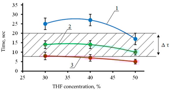 Swelling time to maximum absorption versus the THF solution concentration. 1–22 ± 1 °C, 2–36 ± 1 °C, 3–65 ± 1 °C. Δτ is the time interval of contact between the liquid and the film.