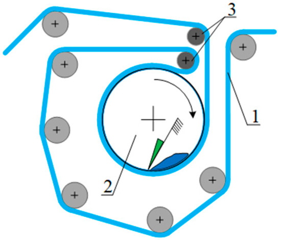 To apply the THF aqueous solution to the surface of PVC shrink film, it is proposed to upgrade the printing equipment. Screen printing equipment modifications need to increase the contact time of the PVC shrink film with the THF-containing paint and optimize the solvent absorption process temperature by the polymer to accelerate internal stress relaxation [44]. The increase in contact time can be achieved by two ways of upgrading the printing units. The first option is to manufacture a cylindrical printing plate with a large diameter, and thus increasing the maximum possible film coverage, as shown in Figure 9. The second option is to increase the number of rollers and the distance between them before the film is transported to the drying chamber under tension to prevent solvent-induced warping and shrinkage.