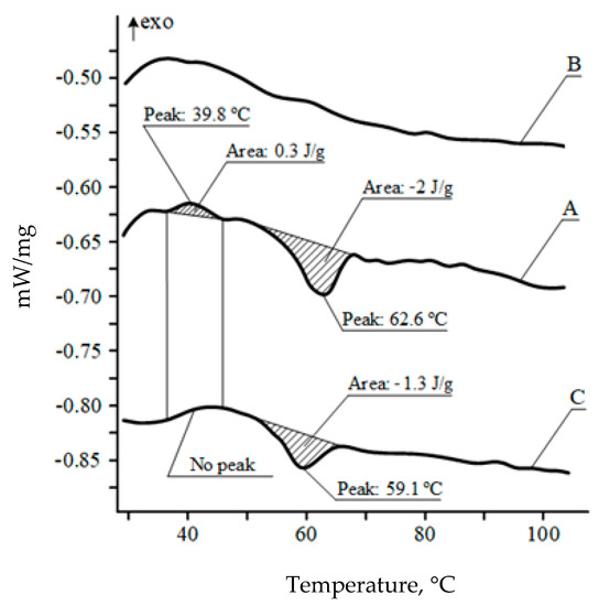 DSC analysis of PVC films with “shape memory”: A—”initial” film sample (1st heating), B—”initial” film sample (2nd heating), C—film sample treated at 36 ± 1 °C with 30% THF solution for 10 min.