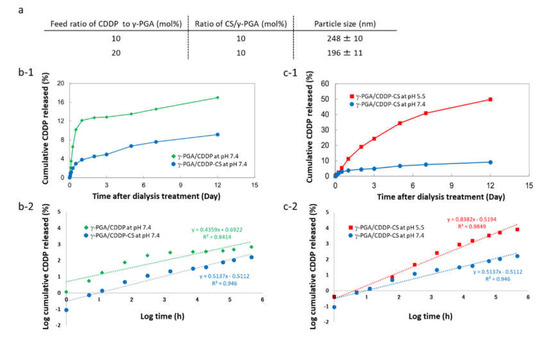 Characteristics of γ-PGA/CDDP-CS. (a) Particle size of γ-PGA/CDDP-CS. Data are represented as mean values ± standard error of the mean (SEM). (b-1) Cumulative CDDP released from γ-PGA/CDDP and γ-PGA/CDDP-CS 12 days after dialysis at pH 7.4 was 17.0% and 9.1%, respectively; (b-2) Korsmeyer–Peppas model: The approximate expressions for γ-PGA/CDDP and γ-PGA/CDDP-CS were calculated as y = 0.4359x + 0.6922 (R2 = 0.84) and y = 0.5137x − 0.5112 (R2 = 0.95), respectively. (c-1) Cumulative CDDP released from γ-PGA/CDDP-CS 12 days after dialysis at pH 7.4 and pH 5.5 (70 mM NaCl) was 9.1% and 49.9%, respectively. (c-2) Korsmeyer–Peppas model: The approximate expression for γ-PGA/CDDP-CS at pH 5.5 was calculated as y = 0.8382x − 0.594 (R2 = 0.98). The data shown are for one representative experiment.