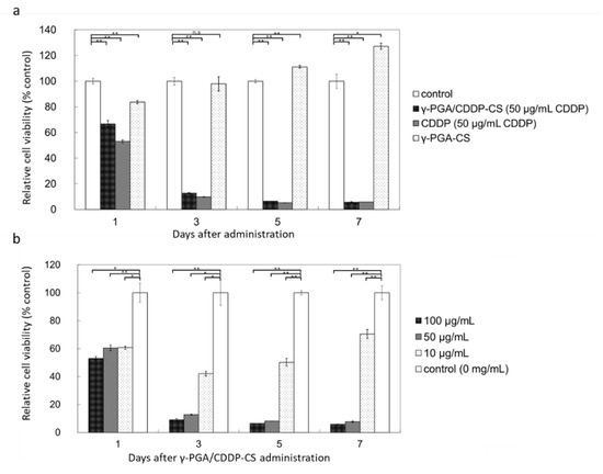 In vitro cytotoxicity of γ-PGA/CDDP-CS. (a) Relative cell viability compared with the control: time-dependent cytotoxicity was observed for all compounds (50 µg/mL CDDP), except γ-PGA-CS, which did not include CDDP. The values were 66.7% ± 2.7%, 53.0% ± 1.1%, and 83.7% ± 1.3% on Day 1; 12.7% ± 0.4%, 9.8% ± 0.2%, and 98.0% ± 5.6% on Day 3; 6.4% ± 0.1%, 4.7% ± 0.2%, and 111.2% ± 1.1% on Day 5; and 5.8% ± 3.4%, 5.0% ± 0.3%, and 127% ± 2.5% on Day 7 for γ-PGA/CDDP-CS, CDDP, and γ-PGA-CS, respectively. (b) Relative cell viability of γ-PGA/CDDP-CS compared with the control at a concentration of 10 μg/mL; cytotoxicity was slightly lower than that at 50 μg/mL and 100 μg/mL. The values for 100, 50, and 10 μg/mL of γ-PGA/CDDP-CS were 53.1% ± 1.2%, 60.4% ± 1.9%, and 60.7% ± 1.1% on Day 1; 9.1% ± 0.8%, 12.7% ± 0.4%, and 42.1% ± 1.7% on Day 3; 6.5% ± 0.0%, 8.1% ± 0.1%, and 50.2% ± 2.8% on Day 5; and 5.8% ± 0.2%, 7.7% ± 0.4%, and 70.4% ± 3.2% on Day 7, respectively. Data are represented as mean values ± standard error of the mean (SEM). Significant differences were analyzed by t-test (* p < 0.05, ** p < 0.01, n.s: Not significant).