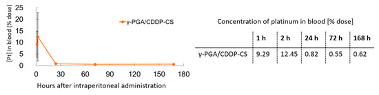 CDDP in the blood was measurable 1 h after administration; it was detectable in the γ-PGA/CDDP-CS group for up to 168 h (0.62% of total CDDP injected) (Figure 4).