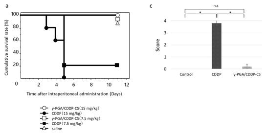 CDDP (7.5 or 15 mg/kg), γ-PGA/CDDP-CS (7.5 or 15 mg/kg), and saline (vehicle control) were injected ip into AB23G2-bearing mice, and they were assessed up to 11 days after administration (n = 5 each). Survival times were recorded to construct Kaplan–Meier survival curves. Further, to assess acute nephrotoxicity, CDDP (n = 4) and γ-PGA/CDDP-CS (n = 4) were administered (ip) at doses of 4.5 mg/kg and 45 mg/kg, respectively. Histological changes due to tubular necrosis were quantitated by determining the percentage of tubules with evident cell necrosis and tubule dilatation, as follows: 0 = none, 1 = ≤10%, 2 = 11–25%, 3 = 26–45%, and 4 = ≥46% [24].