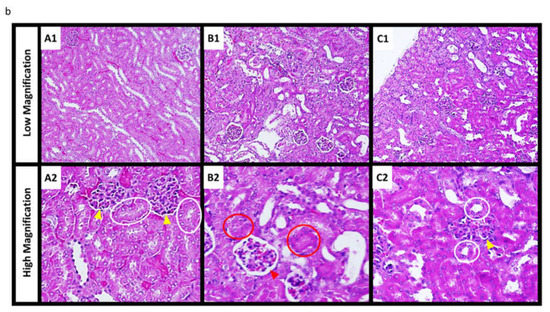 In the high-dose (15 mg/kg) CDDP-saline group, individual mice began to die on the third day after administration, and none (0%) survived beyond Day 5. In the low-dose (7.5 mg/kg) group, survival on Day 5 was 20%. In the high-dose (15 mg/kg) γ-PGA/CDDP-CS group, survival was 100% on Day 5 (Figure 5a). The mean survival time of mice that received treatment with CDDP or γ-PGA/CDDP-CS was significantly prolonged (p < 0.05) compared with that of mice treated with free CDDP. Histological analysis of the kidneys after administration of saline, 4.5 mg/kg CDDP, and 45 mg/kg γ-PGA/CDDP-CS revealed damage to the proximal renal tubule in the CDDP-saline group but not in the vehicle control or γ-PGA/CDDP-CS groups. Mesenchymal kidney tissue in the γ-PGA/CDDP-CS group was slightly edematous, but the renal tubules were intact (Figure 5b).