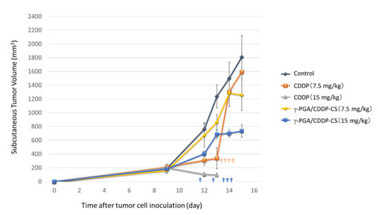 All mice in the high-dose and 80% in the low-dose CDDP groups had died by Day 14 after tumor cell implantation (Day 5 after drug administration). In the control group, the nodule diameter increased over time. In the high-dose γ-PGA/CDDP-CS group, a transient increase in the nodule diameter was suppressed in a dose-dependent manner from Days 13 to 15. However, in the low-dose group, the nodule diameter was similar to that in the control group (Figure 6).