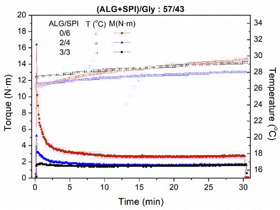 As the thermal response of every sample is similar regardless of the ALG/SPI ratio, neither major protein–protein nor protein–polysaccharide interactions were expected to occur during mixing. It has been reported that different plasticizers or protein sources could promote a noteworthy reticulation of polymeric blends within the mixer, resulting in an important increase of temperature during the mixing stage [39,41].