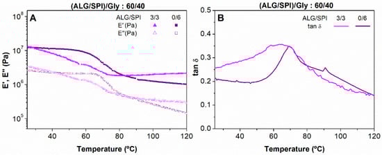 Evolution of the viscoelastic moduli (A) and loss tangent (B) with temperature of alginate + soy protein isolate/glycerol blends with ALG/SPI ratios: 0/6, 2/4, and 3/3, maintaining the ALG + SPI/Gly ratio of 60/40.