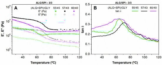 Evolution of the viscoelastic moduli (A) and loss tangent (B) with temperatures for alginate + soy protein isolate/glycerol blends with different ratios: 55/45, 57/43, and 60/40, maintaining the ALG/SPI ratio of 3/3.