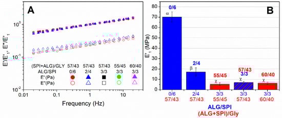 Normalized mechanical spectra of alginate + soy protein isolate/glycerol composites with ratios of: 55/45, 57/43, and 60/40, keeping the ALG/SPI ratio at 3/3, and with ALG/SPI ratios: 0/6, 2/4, and 3/3, keeping the ALG + SPI/Gly ratio at 57/43 (A). The elastic moduli of the samples obtained at 1 Hz (B). Greek letters indicate that average values are statistically different (p < 0.05).