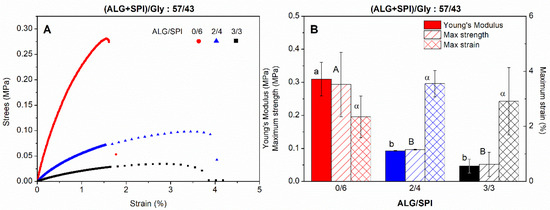 Strain–stress curves (A) and main mechanical parameters (B) of alginate + soy protein isolate/glycerol composites with different ALG/SPI ratios (0/6, 2/4, and 3/3), keeping the ALG + SPI/Gly ratio at 57/43. Lower-case, upper-case, and Greek letters indicate that average values are statistically different (p < 0.05).