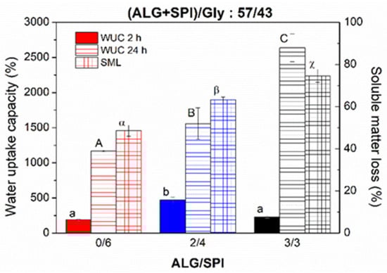Water uptake capacity after water immersion for 2 and 24 h and soluble matter loss of alginate + soy protein isolate/glycerol composites with ALG/SPI ratios: 0/6, 2/4, and 3/3, maintaining the ALG/SPI/Gly ratio: 57/43. Lower-case, upper-case, and Greek letters indicate that average values are statistically different (p < 0.05).